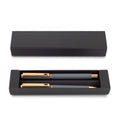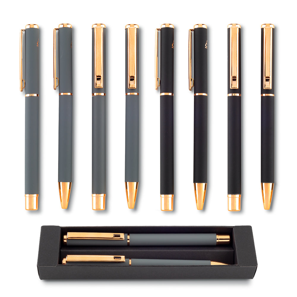 Set de bolígrafos metálicos tipo roller y mecanismo twist. Empaque caja individual.