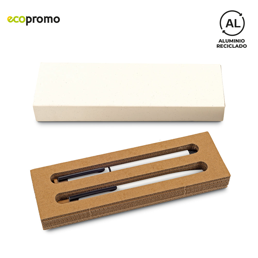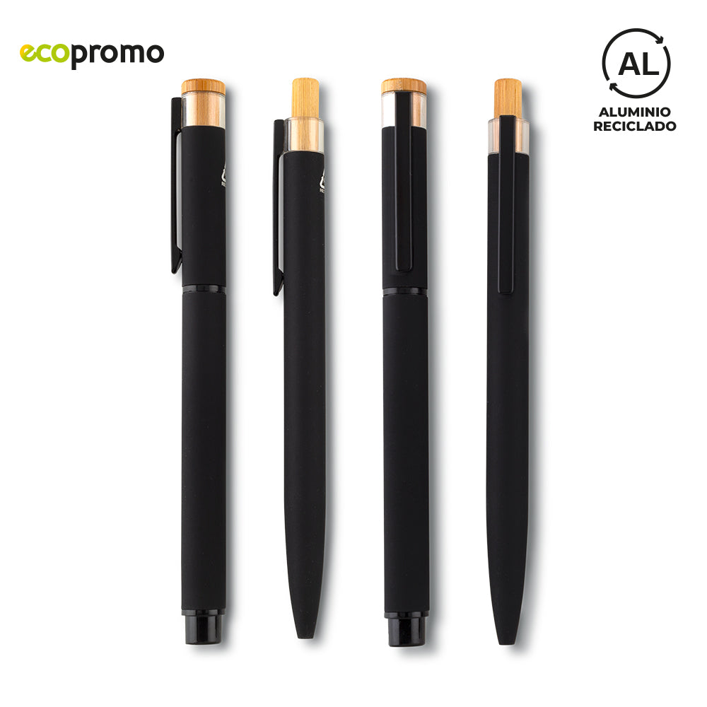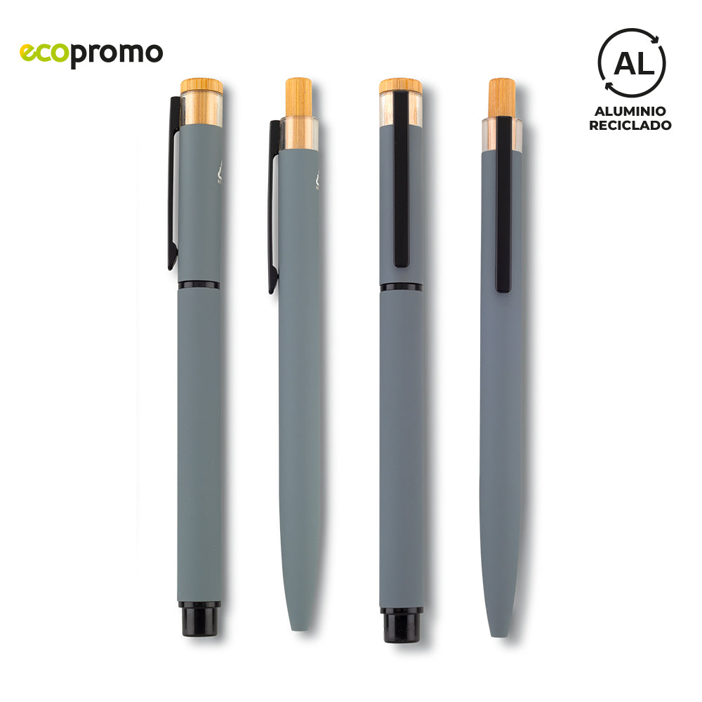 Set de bolígrafos tipo roller y de mecanismo push, en aluminio reciclado con clip metálico.
