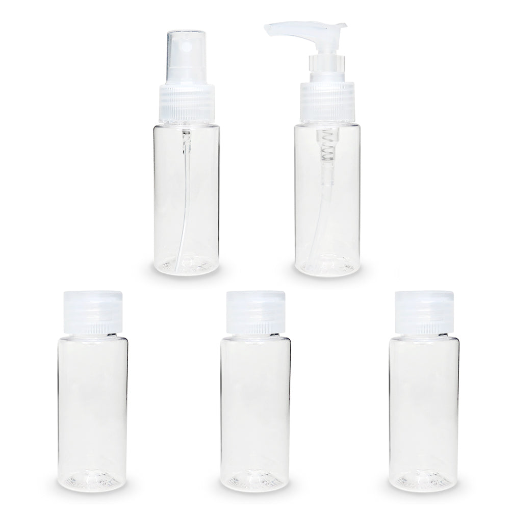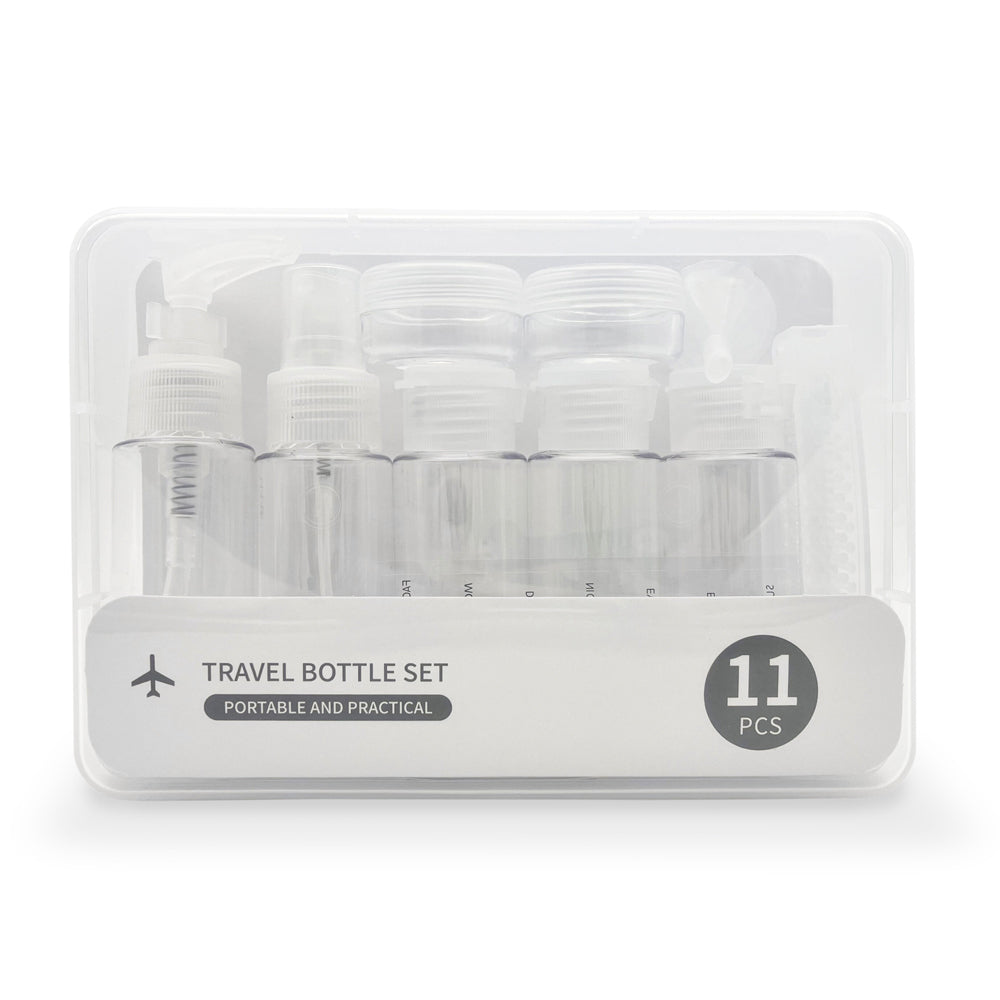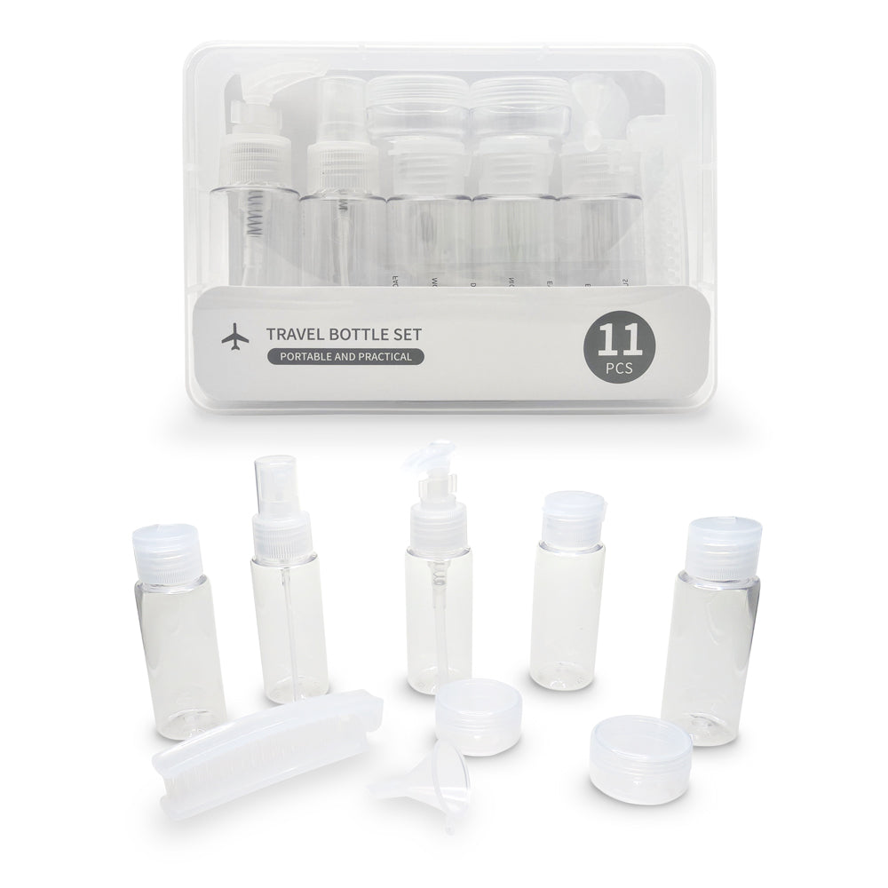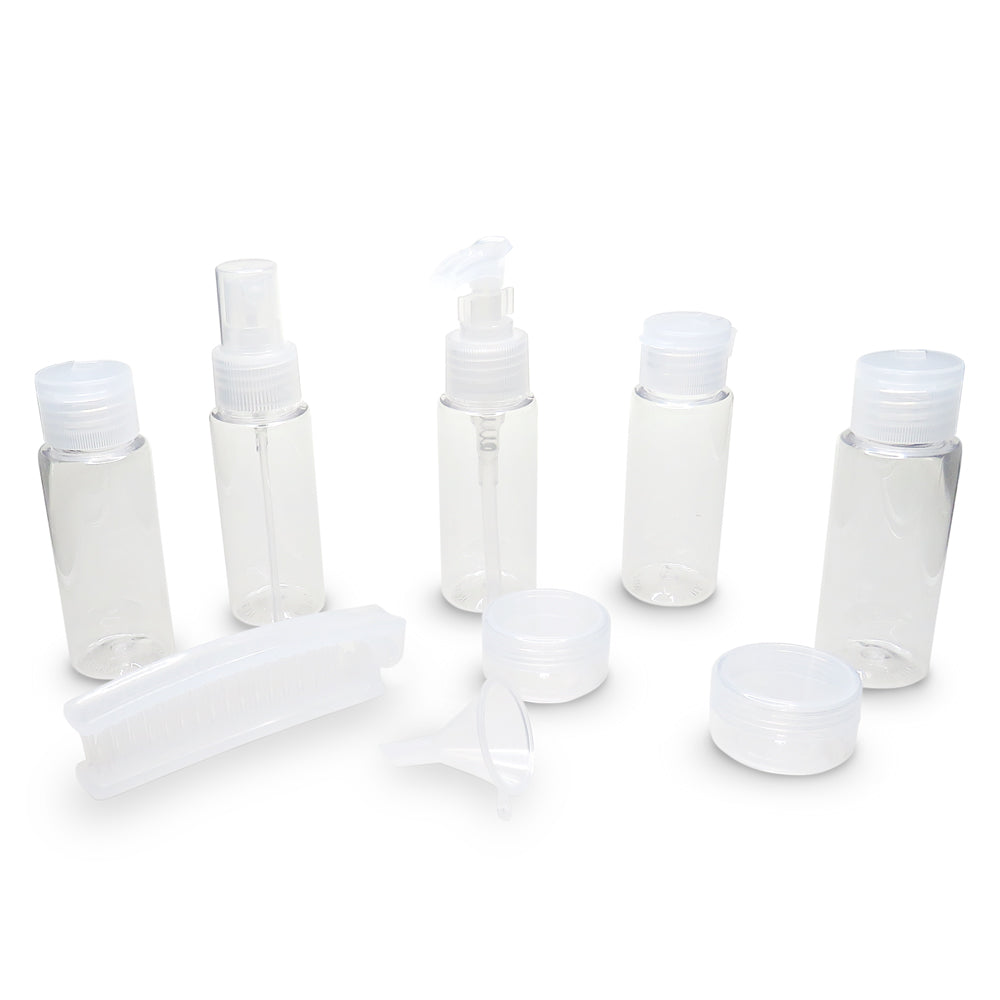 Set de 11 piezas plásticas para viaje: 3 frascos con tapa abatible (500 ml), 1 frasco dosificador (50 ml), 1 frasco tapa spray (50 ml), 2 tarros de crema (10 ml), 1 peine, 1 embudo, 1 espátula, identificadores adhesivos.