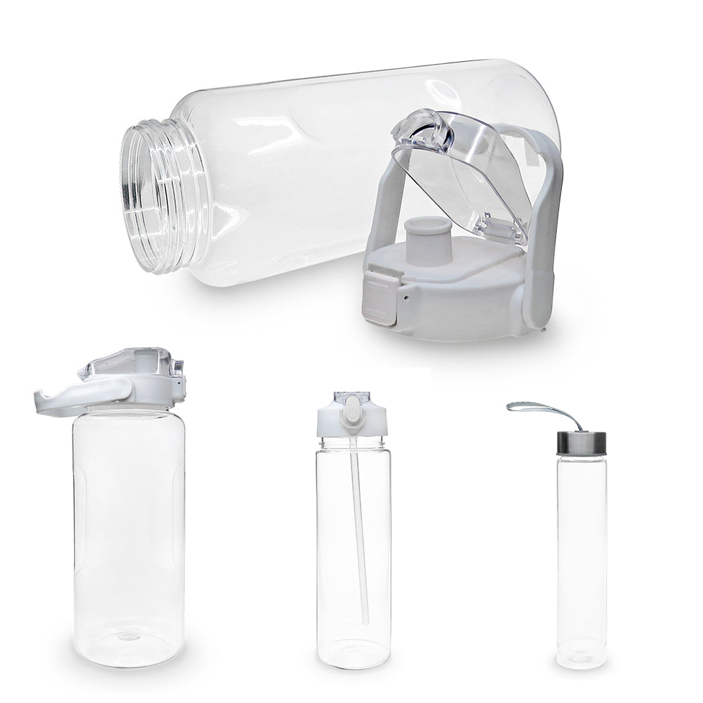 Set de 3 Botilitos en material PET, botilito de 2000ml, botilito con pitillo de 1000ml y botilito de 500ml. Se puede almacenar uno dentro de otro para guardar. No usar con bebidas calientes.