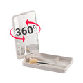 Estuche plástico con espejo giratorio de 360°con luz. Incluye set de 5 brochas para maquillaje. Funciona con 2 pilas CR2032. Empaque caja individual.