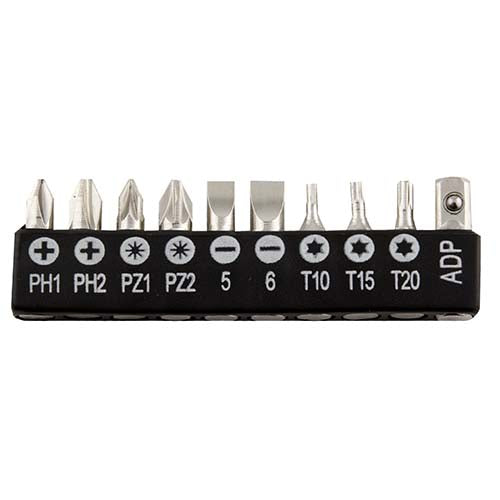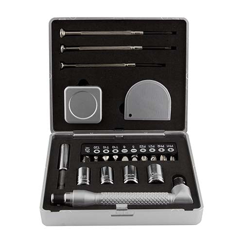 | Descripción: Contiene 3 desarmadores de relojero, flexometro de 1 m, cuter, desarmador con 10 puntas diferentes e intercambiables, dados y extension. Incluye estuche. | |