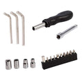 | Descripción: Contiene desarmador con 10 puntas diferentes e intercambiables, 3 llaves hexagonales, dado extension y 4 dados. Incluye estuche de tela. | |