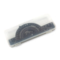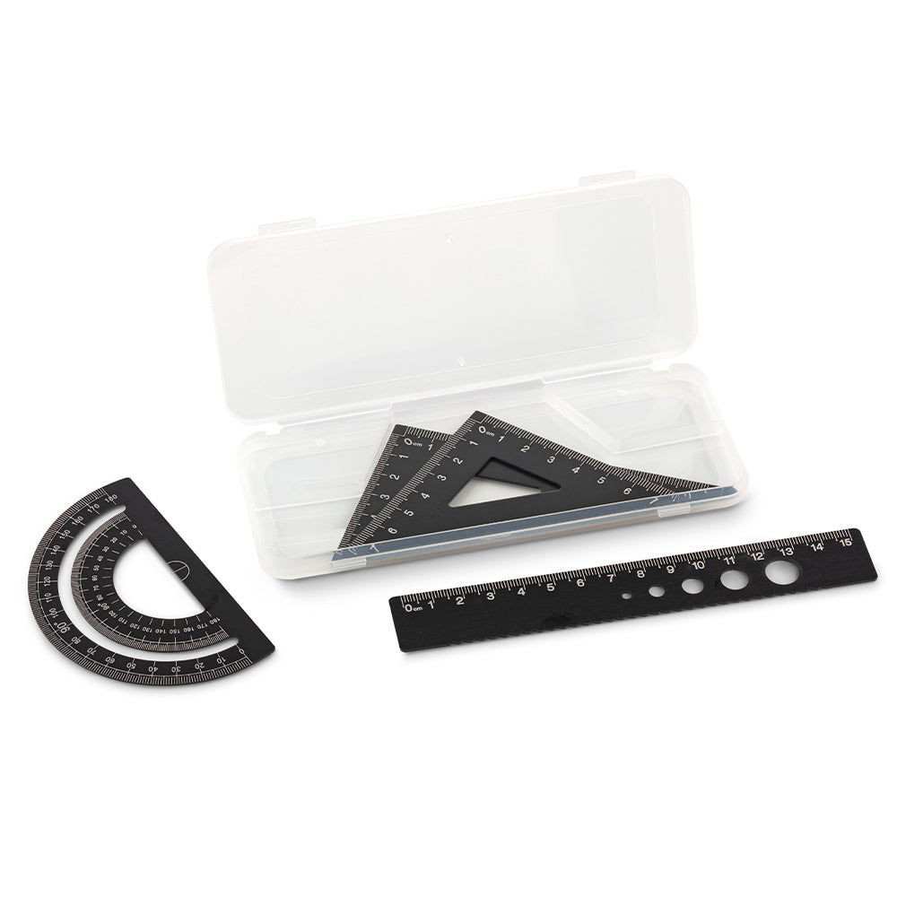 Set de cuatro reglas en aluminio. Incluye una regla de 15 cm, una escuadra de 7cm, una escuadra de 10 cm, un transportador de 180° y un estuche plástico.