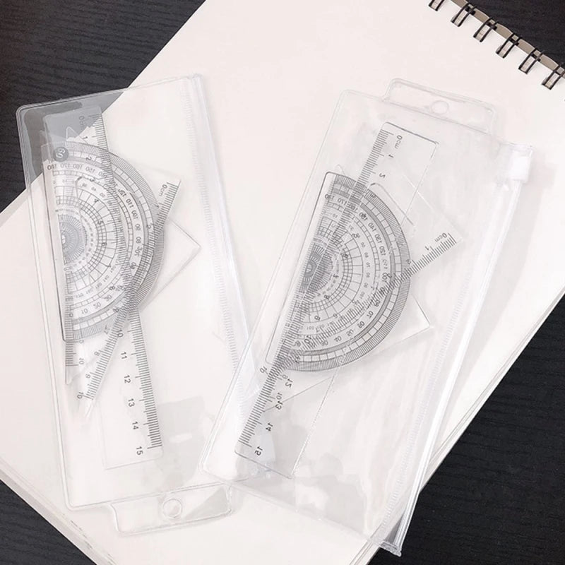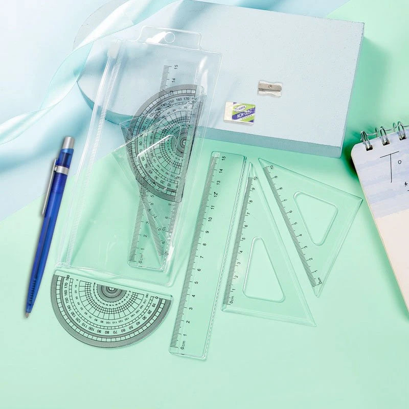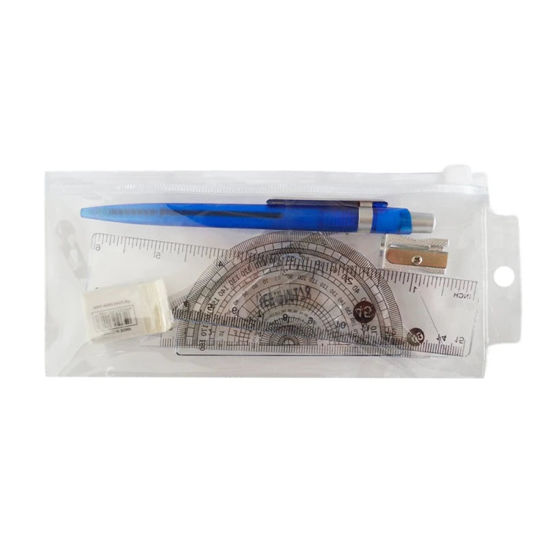 Set que incluye 2 escuadras, regla de 15 cm, transportador, bolígrafo plástico, tajalápiz metálico y borrador de nata.