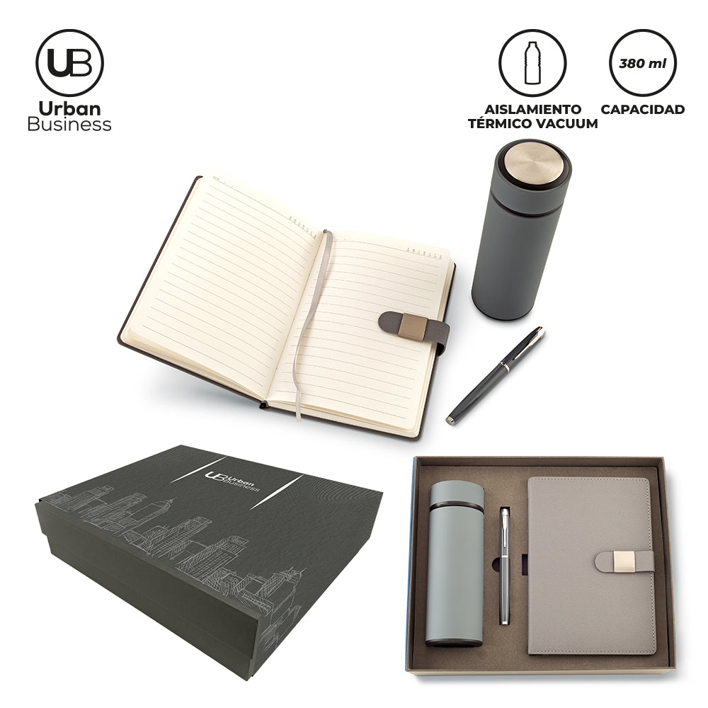 Set de libreta de 21 cm x 14.5 cm de 96 hojas rayadas. Con cubierta en poliuretano y clip con imán. Botilito de 380 ml doble pared Vacuum en acero inoxidable, con aislamiento térmico que mantiene la bebida fría o caliente hasta 6h aprox (puede variar dependiendo de las condiciones climáticas). Bolígrafo plástico tipo roller. Empaque caja individual.