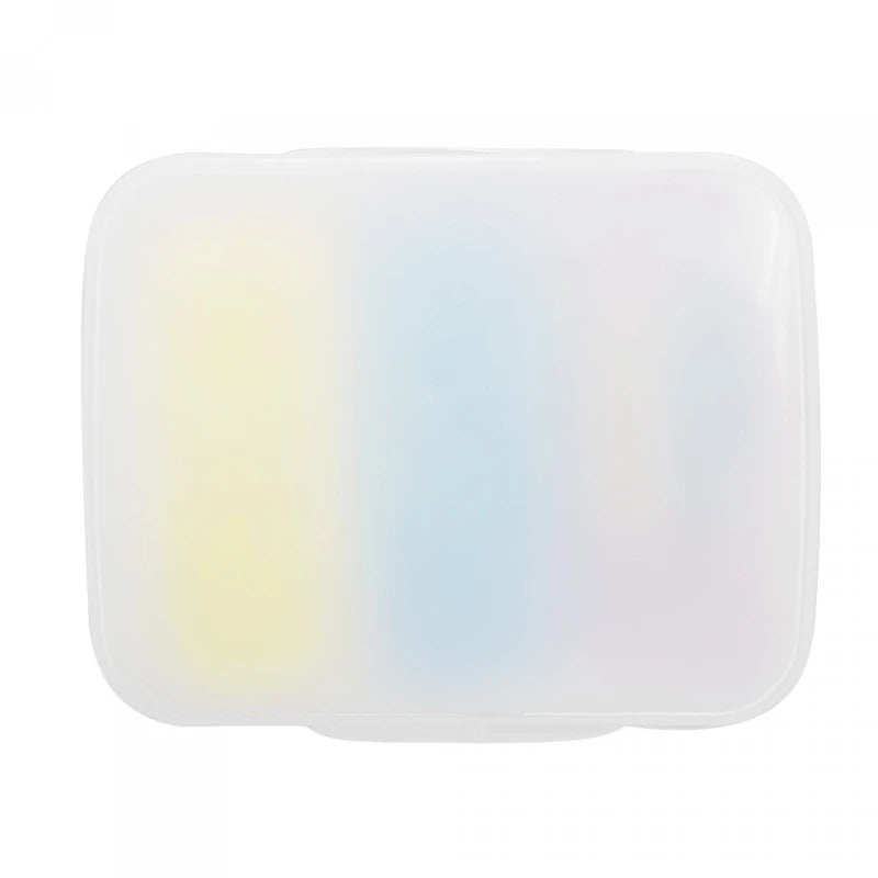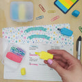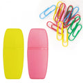 Con dos mini resaltadores de cera y clips multicolores en caja plástica. Caja: 7.9 x 6.8 cm. Resaltador: 5.5 x 2 cm.