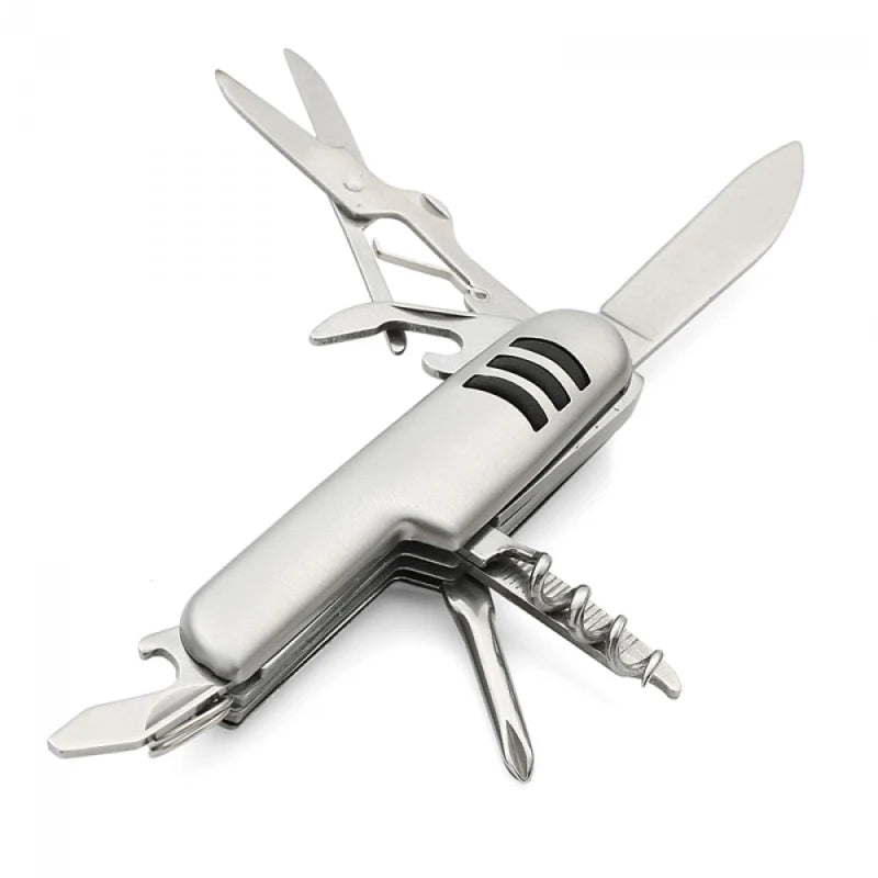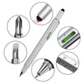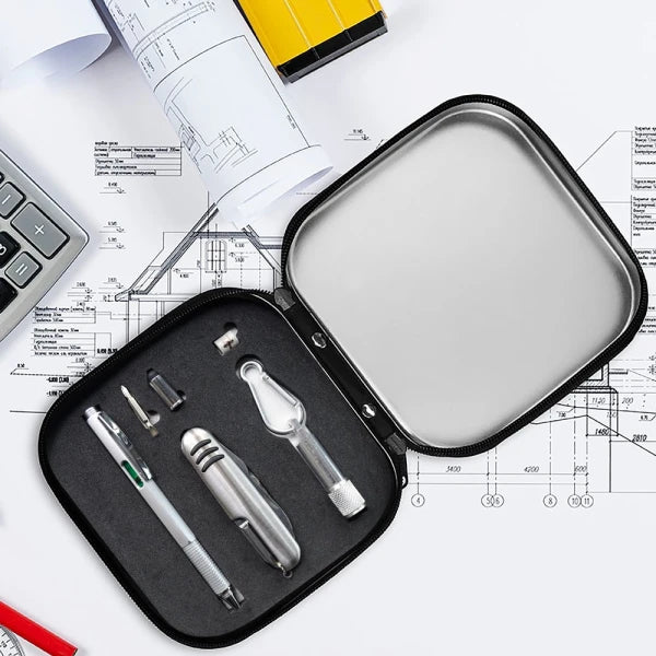 Set de herramientas que incluye: Boligrafo touch con nivel, regla y juego de destornilladores, navaja 7 funciones en acero inoxidable, linterna LED y mosquetón. De 15 x 15 cm.