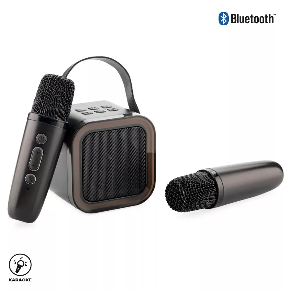 Speaker Bluetooth Karaoke plástico de 6w. Batería incorporada de 800mAh. Con luz multicolor, entradas USB, Tipo C y tarjeta SD (no incluida). Conexión para audífonos. Con manija en imitación cuero para cargar. Incluye micrófono inalámbrico con carga por cable Tipo C.