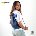Bolsa tula en poliéster reciclado RPET. Con banda reflectiva y cordones para cargar y cerrar.