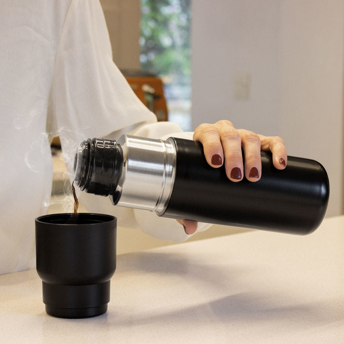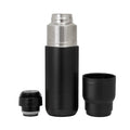 Termo con taza. Termo Doble pared sellado al vacío. Interior en acero 304 y exterior en acero 201. Tapa y taza plásticas a rosca color negro. Tapón con apertura y cierre a presión. Mantiene por más de 12 hs la temperatura de las bebidas calientes y 24 hs de las bebidas frías.