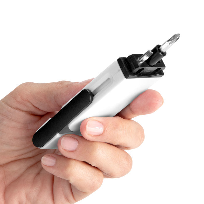 Set de destornillador con 2 puntas intercambiables ocultas (plana de 3,5 mm y phillips de 2mm.) Ambas en CR-V que las hace más durables y resistentes a la corrosión. Incluye cinta métrica de 1 m. con escalas en centímetros, pulgadas y pies. Cuerpo imantado para poder fijar las puntas. Apertura por deslizamiento.