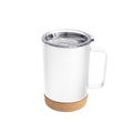 Mug doble pared con asa, sellado al vacío. Mug con aislamiento térmico. Tecnología vacuum. Interior en acero 304 y exterior en acero 201. Tapa de poliestireno con anillo de silicona. Asa metálica. Base de corcho. Pintura acabado semi mate. Mantiene hasta 12 hs la temperatura de las bebidas calientes y 24 hs de las bebidas frías.