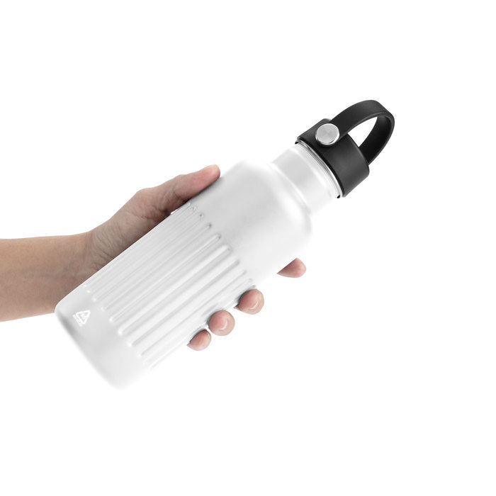 Botella doble pared, sellada al vacío. Botella con aislamiento térmico. Tecnología vacuum. Interior de acero 304 reciclado y exterior de acero 201. Tapa a rosca de polipropileno, interior plástico. Asa reforzada de silicona. Pintura acabado semi mate. Cuerpo texturado para un mejor agarre. Mantiene hasta 12 hs la temperatura de las bebidas calientes y 24 hs de las bebidas frías.