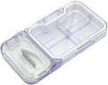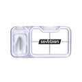 Pastillero organizador corta pastilla. Compartimento principal con cuatro divisiones y recubrimiento perimetral de silicona. Compartimento secundario con base de silicona y soporte regulable de pastillas. Cuchilla de acero incorporada en la tapa. Ambos compartimentos con tapa rebatible y cierre a presión.