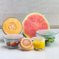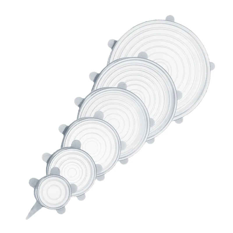 Set de 5 piezas de diferentes tamaños en silicona elástica de grado alimenticio y adaptable a cualquier tapper o bowl de vidrio preferiblemente.