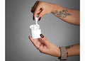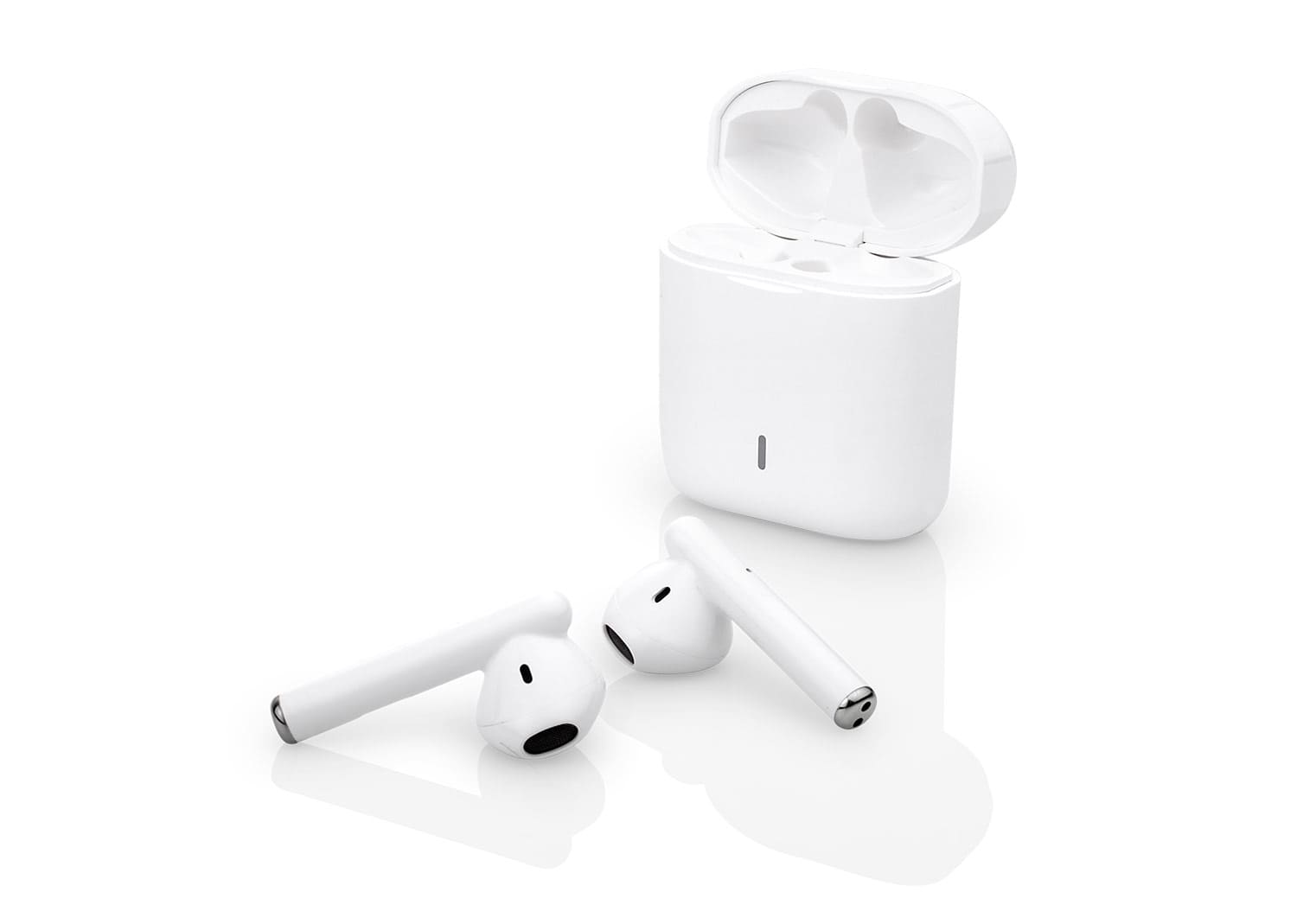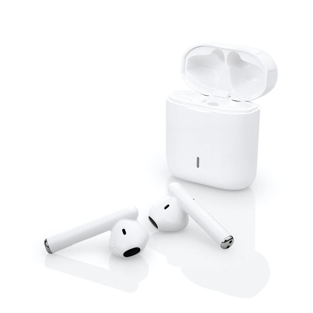 Audífonos Bluetooth versión 5.0 + EDR, en estuche de carga. Conexión inalámbrica (TWS) sonido estéreo inalámbrico con separación de canales izquierdo y derecho, efectos de sonido HIFI, y audífono izquierdo y derecho tienen una función Bluetooth que se puede utilizar de manera independiente. Distancia de transmisión: 6-10 metros. Tiempo de conversación: 3-4 horas. Batería de auriculares: 25 mAh. Batería de almacenamiento: 250 mAh. Incluye cable puerto tipo C para carga.