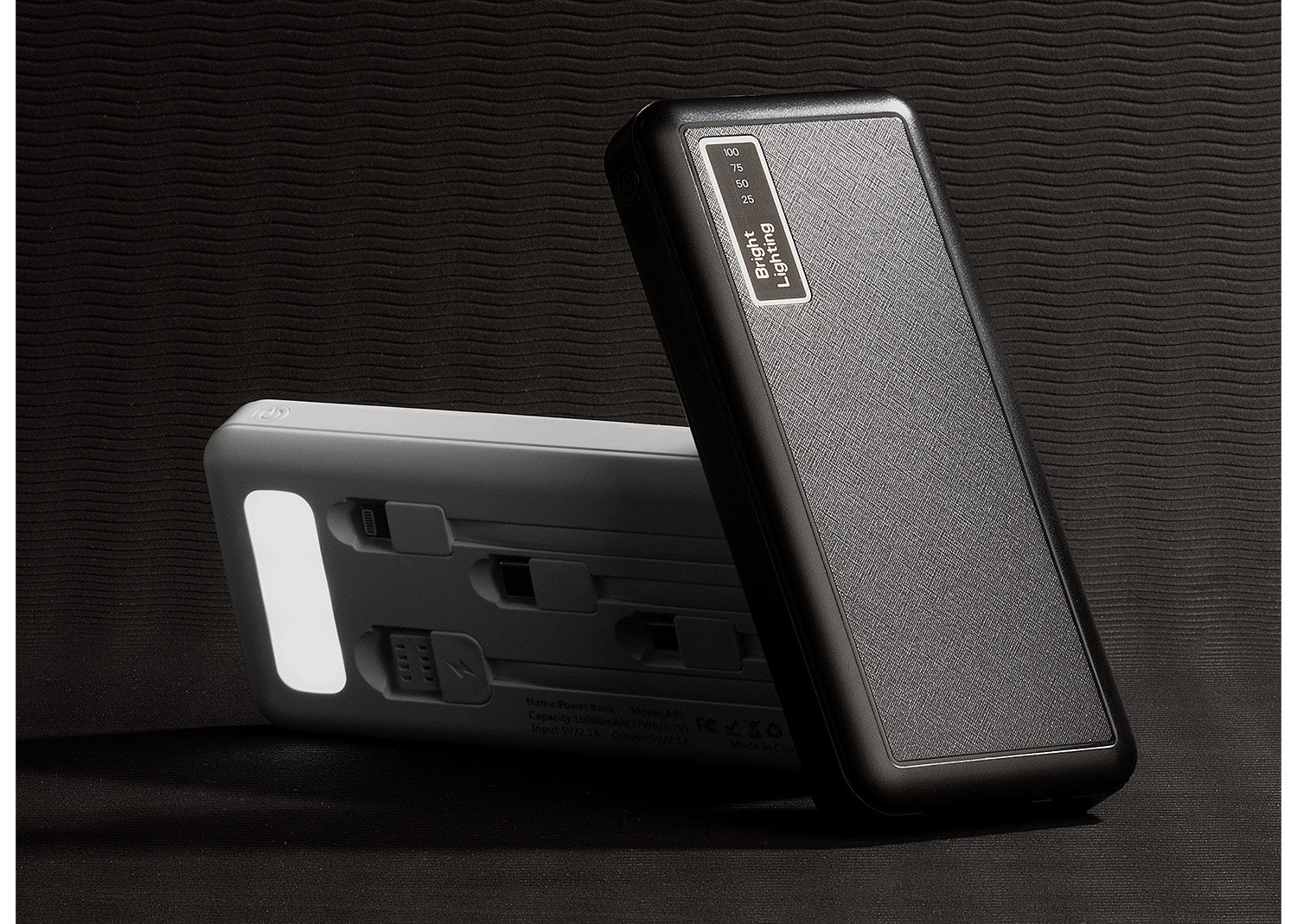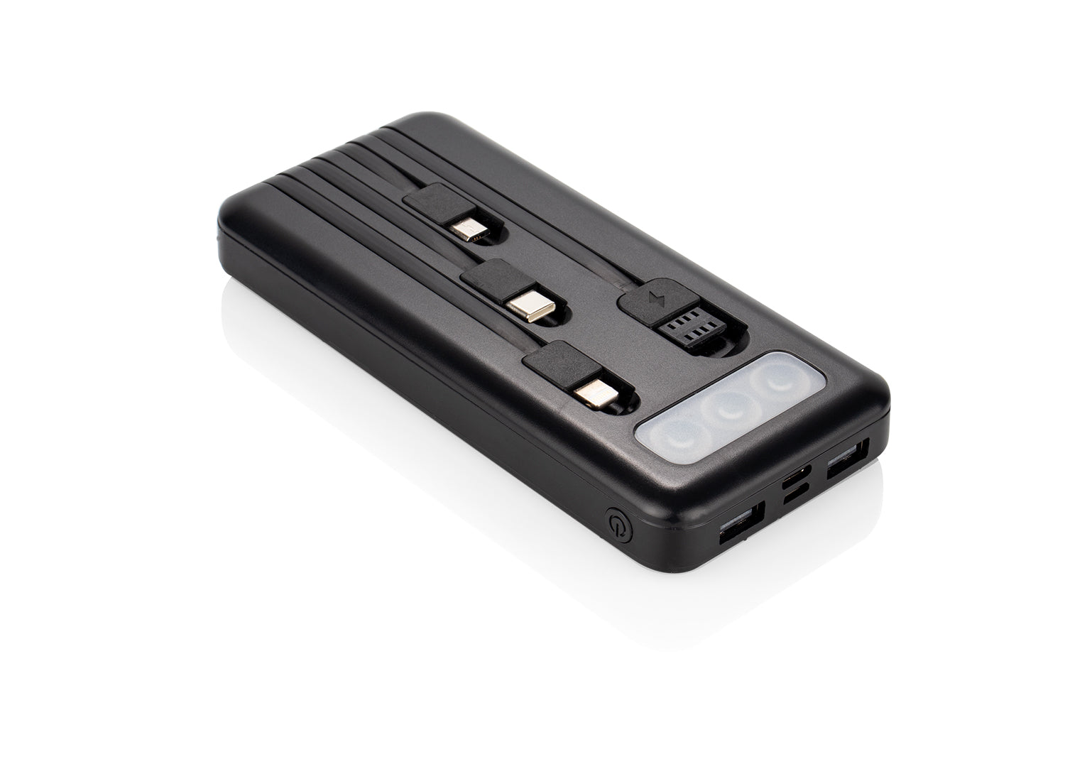 Muticargador con botón de encendido, salidas tipo C, Mirco,Lightning y USB.. Incluye función de linterna. 10.000 mAh, Entrada: 5V/2.1A Salida: 5V/2.1A