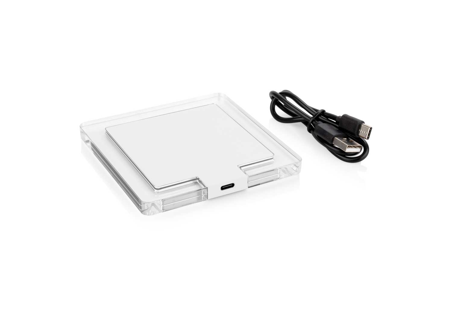 Cargador inalámbrico de 15 W con elegante diseño de bordes transparentes y superficie en contraste. Cuenta con entrada Tipo C para una carga estable y eficiente, compatible con dispositivos que soporten carga inalámbrica Qi. Ideal para mantener tu espacio de trabajo moderno y ordenado.