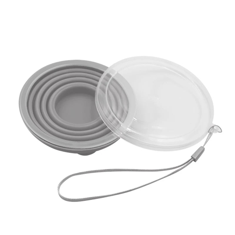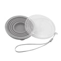 Vaso en silicona de grado alimenticio plegable en 4 cuerpos con tapa removible. Cordón para colgar. Capadidad 200 ml. De 8.3 x 8.6 cm de diámetro.