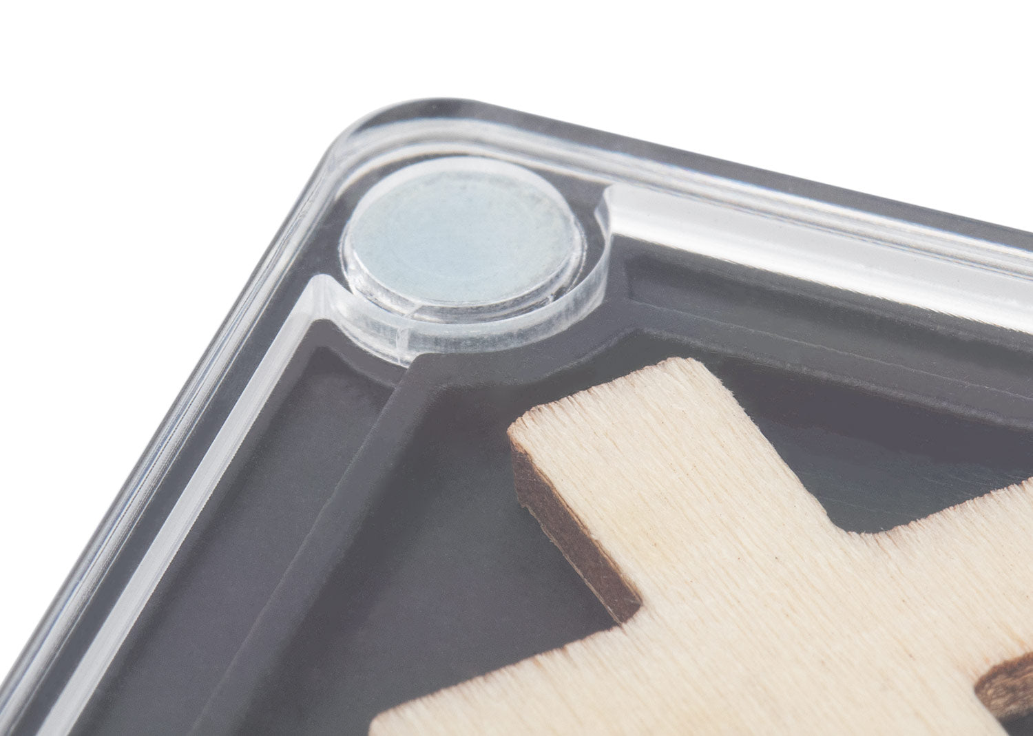 Portavasos de plástico con esquinas imantadas que permiten fijarlo a superficies metálicas; en su interior incluye un juego de triqui de madera con piezas en forma de “X” y “O” (2,2 X 2,2), ideal como accesorio decorativo y funcional para escritorio o espacios de entretenimiento.